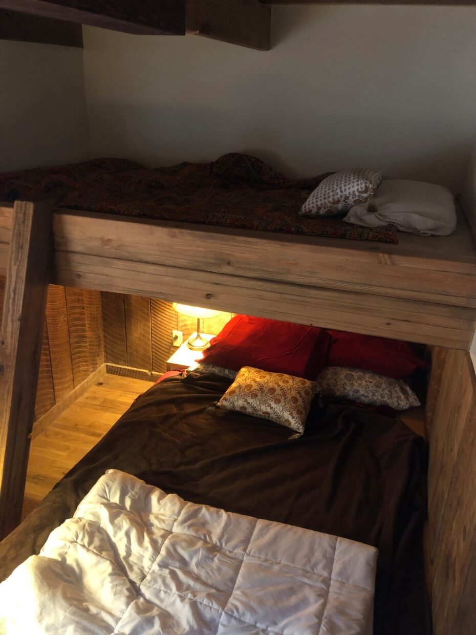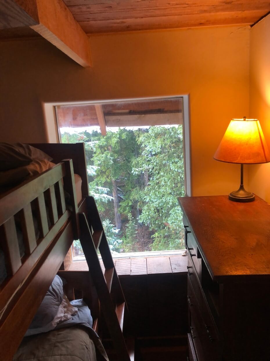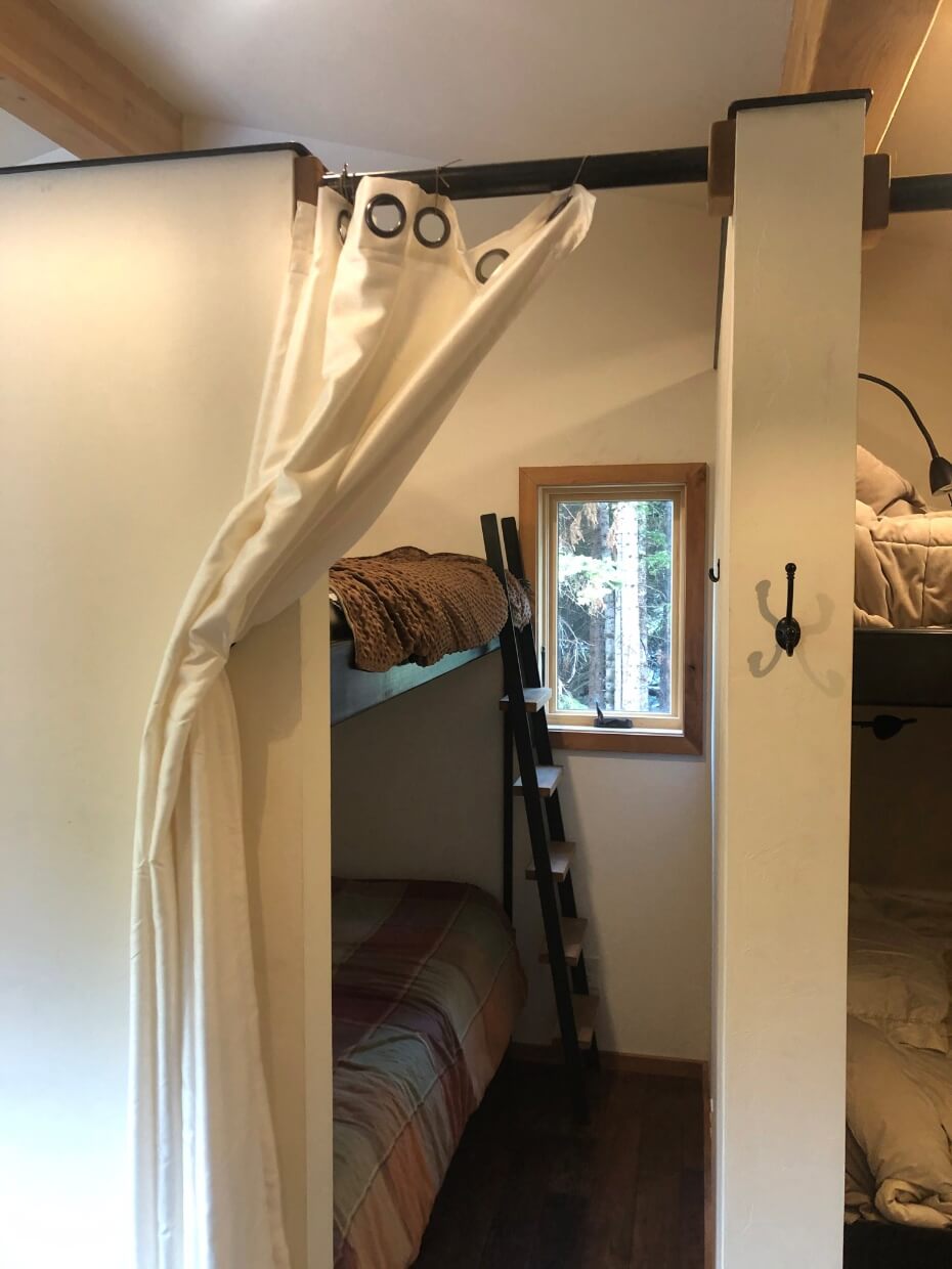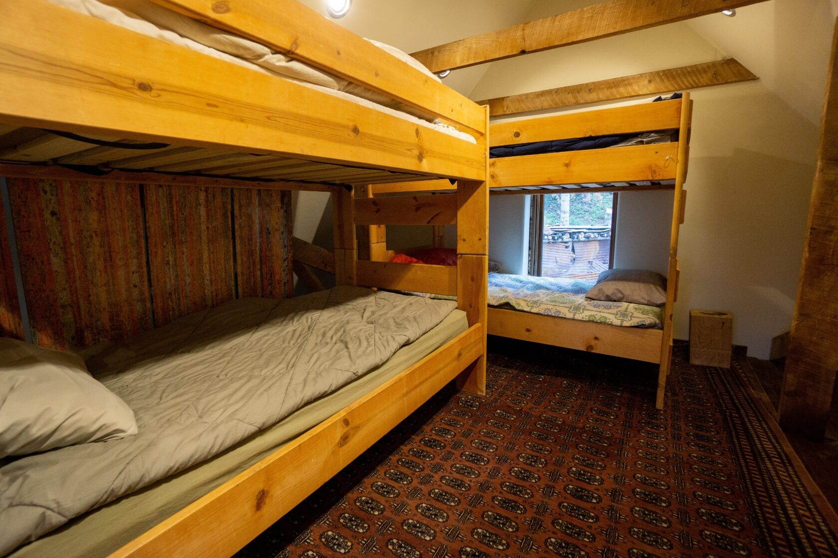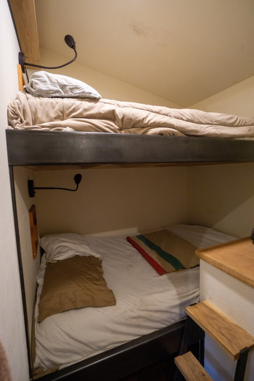 In the newly constructed Main Lodge, there is a shared/partitioned bunk room with several nooks. The Camp Bird nook and the Imogene nooks each have an lower and upper single twin bunk. The Hidden Treasure nook has a double lower bunk and a double upper bunk.